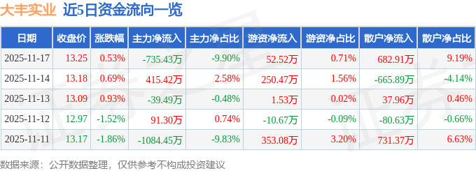 证券之星消息,截至2025年11月17日收盘,大丰实业(603081)报收于13.25元,上涨0.53%,换手率1.34%,成交量5.64万手,成交额7428.39万元。