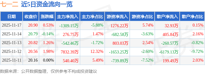 证券之星消息,截至2025年11月17日收盘,七一二(603712)报收于20.9元,上涨0.53%,换手率1.38%,成交量10.67万手,成交额2.22亿元。