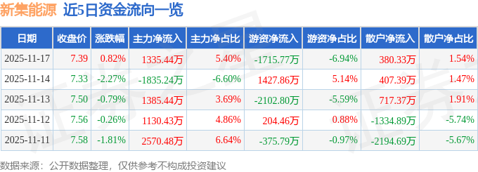 证券之星消息,截至2025年11月17日收盘,新集能源(601918)报收于7.39元,上涨0.82%,换手率1.3%,成交量33.58万手,成交额2.47亿元。