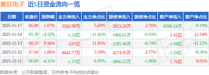 证券之星消息,截至2025年11月17日收盘,景旺电子(603228)报收于66.0元,上涨1.07%,换手率1.58%,成交量15.38万手,成交额10.24亿元。