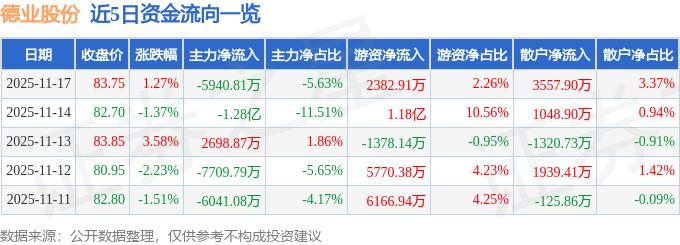 证券之星消息,截至2025年11月17日收盘,德业股份(605117)报收于83.75元,上涨1.27%,换手率1.41%,成交量12.82万手,成交额10.54亿元。