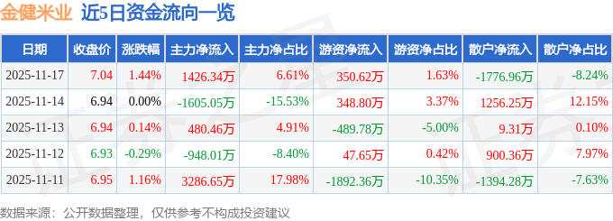 证券之星消息,截至2025年11月17日收盘,金健米业(600127)报收于7.04元,上涨1.44%,换手率4.77%,成交量30.64万手,成交额2.16亿元。