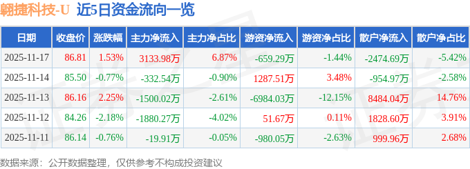 11月17日的资金流向数据方面,主力资金净流入3133.98万元,占总成交额6.87%,游资资金净流出659.29万元,占总成交额1.44%,散户资金净流出2474.69万元,占总成交额5.42%。