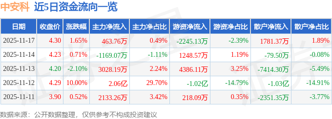 股票行情快报:中安科(600654)11月17日主力资金净买入463.76万元