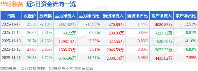 证券之星消息,截至2025年11月17日收盘,华明装备(002270)报收于25.5元,下跌2.19%,换手率1.42%,成交量12.76万手,成交额3.26亿元。