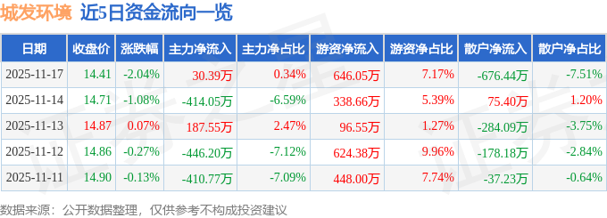 证券之星消息,截至2025年11月17日收盘,城发环境(000885)报收于14.41元,下跌2.04%,换手率0.97%,成交量6.23万手,成交额9008.01万元。