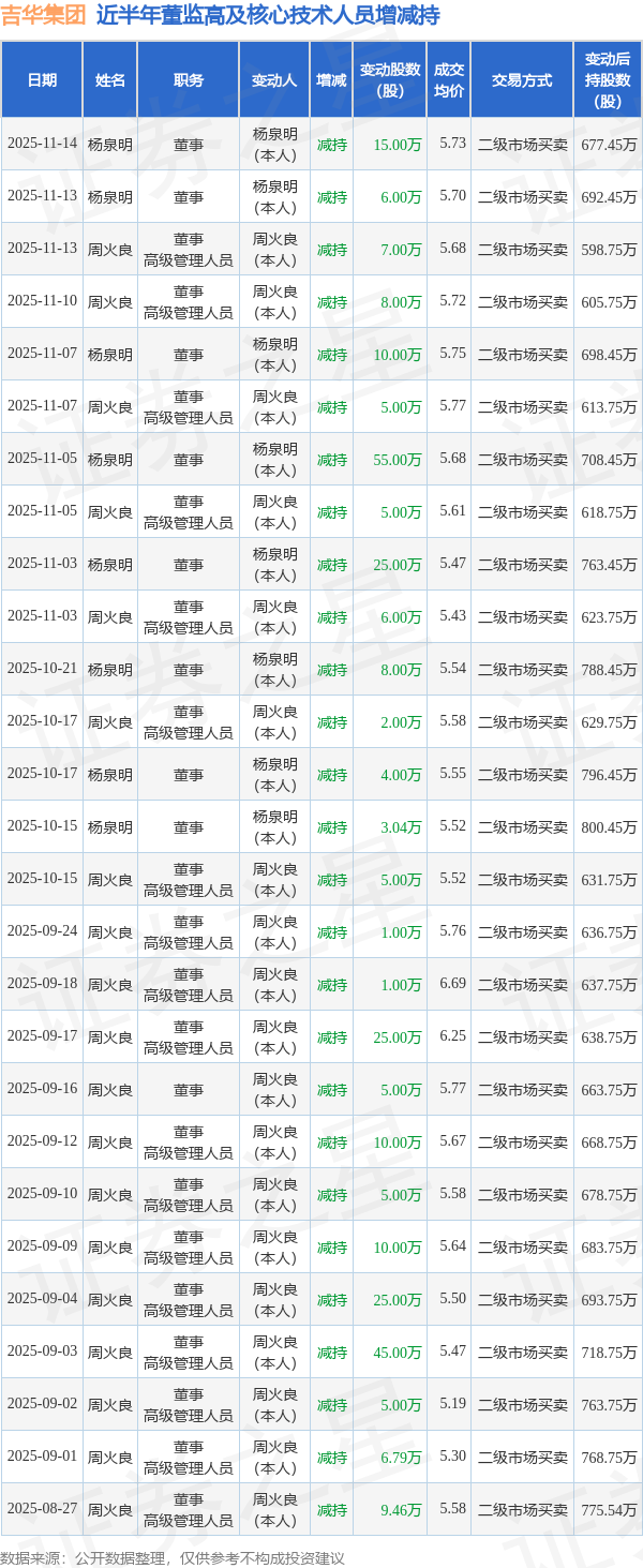 吉华集团近半年内的董监高及核心技术人员增减持详情如下: