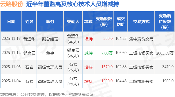 云路股份近半年内的董监高及核心技术人员增减持详情如下: