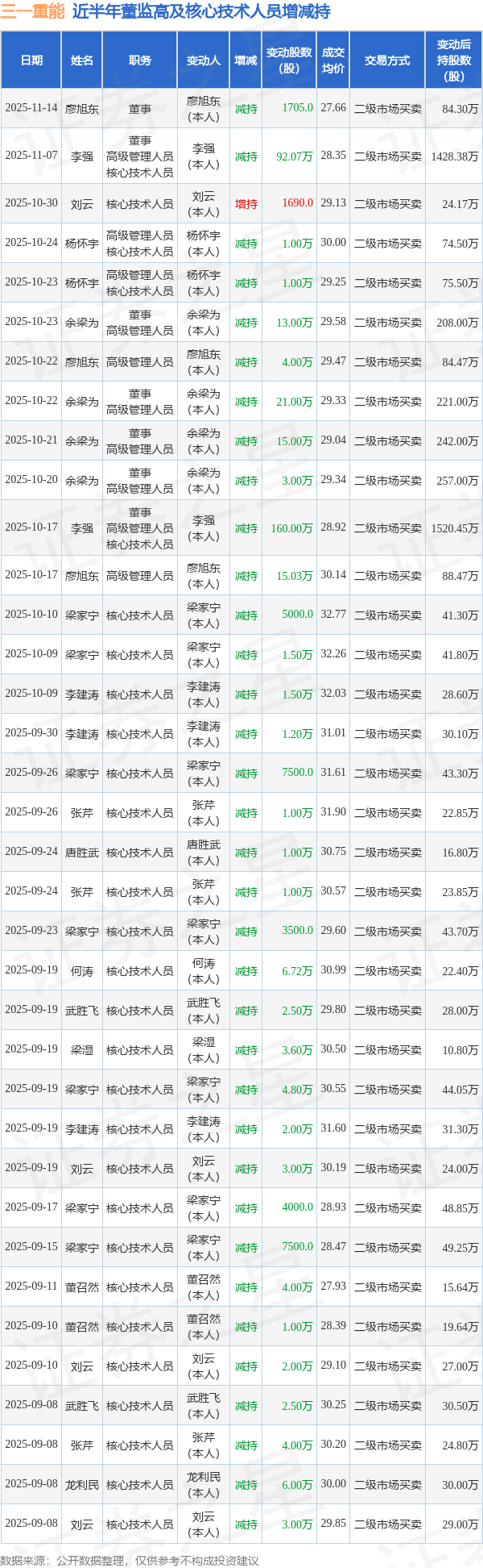 三一重能近半年内的董监高及核心技术人员增减持详情如下: