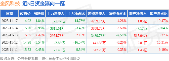 11月17日的资金流向数据方面,主力资金净流出1.47亿元,占总成交额14.73%,游资资金净流入4259.14万元,占总成交额4.26%,散户资金净流入1.05亿元,占总成交额10.47%。