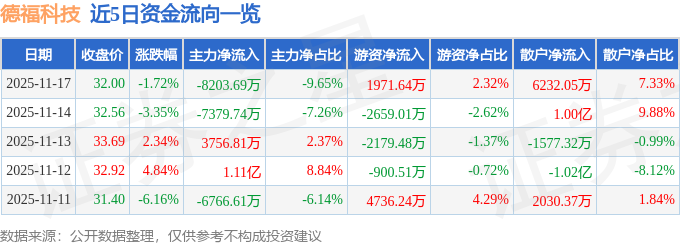 证券之星消息,截至2025年11月17日收盘,德福科技(301511)报收于32.0元,下跌1.72%,换手率6.99%,成交量26.16万手,成交额8.5亿元。