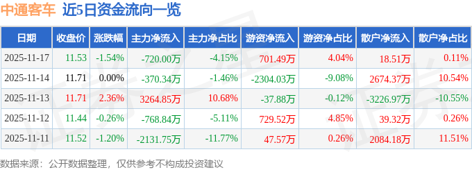 证券之星消息,截至2025年11月17日收盘,中通客车(000957)报收于11.53元,下跌1.54%,换手率2.53%,成交量15.03万手,成交额1.74亿元。