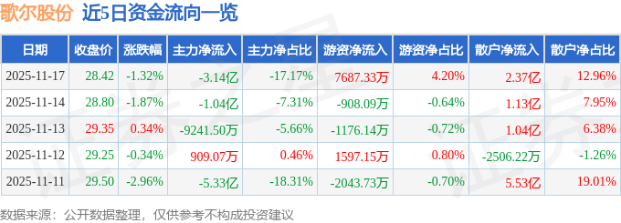 证券之星消息,截至2025年11月17日收盘,歌尔股份(002241)报收于28.42元,下跌1.32%,换手率2.05%,成交量64.25万手,成交额18.3亿元。