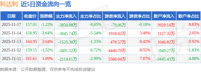 证券之星消息,截至2025年11月17日收盘,科达利(002850)报收于157.01元,下跌1.22%,换手率1.43%,成交量2.82万手,成交额4.45亿元。