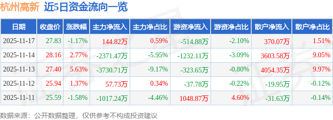 股票行情快报:杭州高新(300478)11月17日主力资金净买入144.82万元