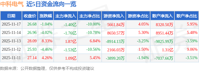 证券之星消息,截至2025年11月17日收盘,中科电气(300035)报收于26.68元,下跌1.04%,换手率9.06%,成交量52.87万手,成交额13.98亿元。