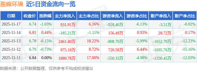 证券之星消息,截至2025年11月17日收盘,盈峰环境(000967)报收于6.74元,下跌1.03%,换手率0.71%,成交量22.52万手,成交额1.51亿元。