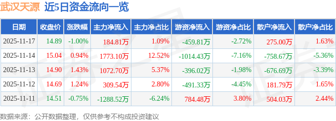 证券之星消息,截至2025年11月17日收盘,武汉天源(301127)报收于14.89元,下跌1.0%,换手率1.7%,成交量11.31万手,成交额1.69亿元。