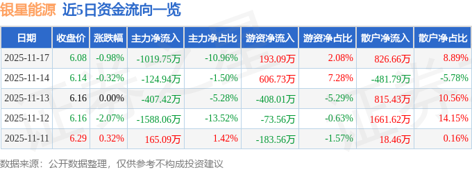 证券之星消息,截至2025年11月17日收盘,银星能源(000862)报收于6.08元,下跌0.98%,换手率2.44%,成交量15.33万手,成交额9303.39万元。