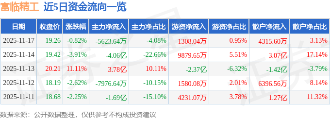 证券之星消息,截至2025年11月17日收盘,富临精工(300432)报收于19.26元,下跌0.82%,换手率4.22%,成交量71.29万手,成交额13.78亿元。