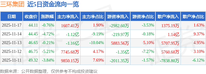 证券之星消息,截至2025年11月17日收盘,三环集团(300408)报收于44.11元,下跌0.76%,换手率1.02%,成交量19.1万手,成交额8.44亿元。