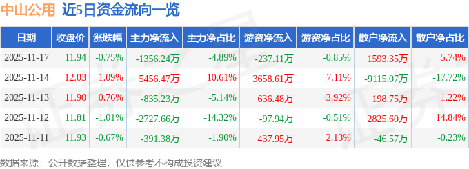 证券之星消息,截至2025年11月17日收盘,中山公用(000685)报收于11.94元,下跌0.75%,换手率1.86%,成交量23.33万手,成交额2.78亿元。
