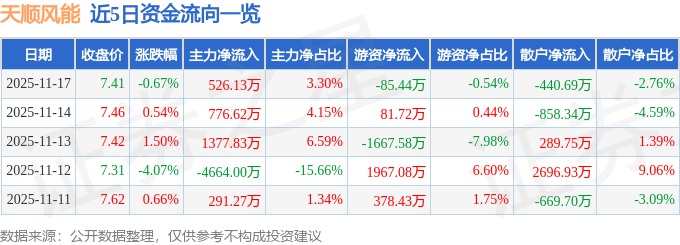 证券之星消息,截至2025年11月17日收盘,天顺风能(002531)报收于7.41元,下跌0.67%,换手率1.21%,成交量21.67万手,成交额1.59亿元。