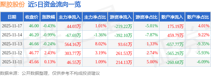 证券之星消息,截至2025年11月17日收盘,聚胶股份(301283)报收于46.0元,下跌0.43%,换手率2.06%,成交量9448.0手,成交额4372.92万元。