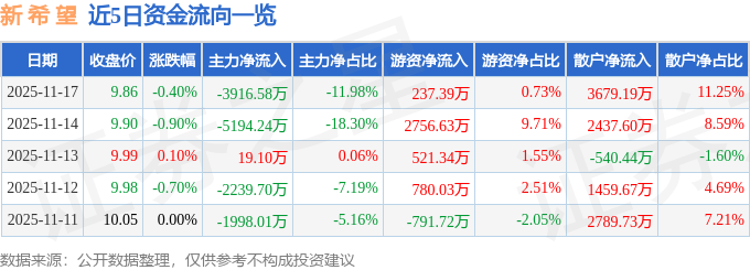证券之星消息,截至2025年11月17日收盘,新 希 望(000876)报收于9.86元,下跌0.4%,换手率0.74%,成交量33.24万手,成交额3.27亿元。