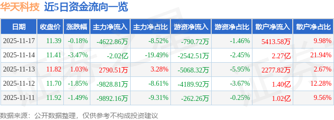 证券之星消息,截至2025年11月17日收盘,华天科技(002185)报收于11.39元,下跌0.18%,换手率1.46%,成交量47.58万手,成交额5.43亿元。