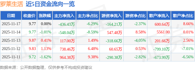 11月17日的资金流向数据方面,主力资金净流出436.43万元,占总成交额6.29%,游资资金净流出164.21万元,占总成交额2.37%,散户资金净流入600.64万元,占总成交额8.66%。