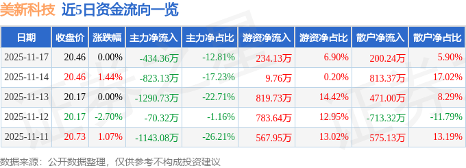 证券之星消息,截至2025年11月17日收盘,美新科技(301588)报收于20.46元,上涨0.0%,换手率2.27%,成交量1.67万手,成交额3391.71万元。