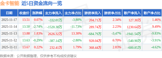 证券之星消息,截至2025年11月17日收盘,金卡智能(300349)报收于13.51元,上涨0.07%,换手率1.74%,成交量6.46万手,成交额8732.1万元。