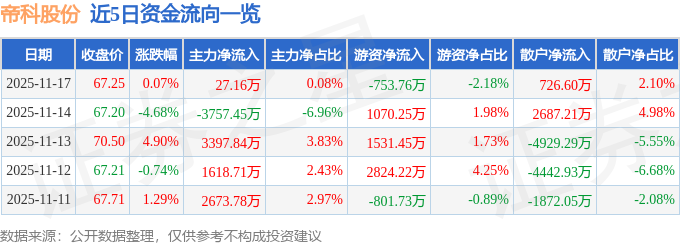 证券之星消息,截至2025年11月17日收盘,帝科股份(300842)报收于67.25元,上涨0.07%,换手率3.97%,成交量5.15万手,成交额3.45亿元。