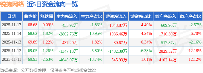 证券之星消息,截至2025年11月17日收盘,锐捷网络(301165)报收于68.68元,上涨0.09%,换手率3.62%,成交量3.46万手,成交额2.37亿元。