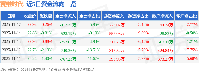 11月17日的资金流向数据方面,主力资金净流出417.35万元,占总成交额5.95%,游资资金净流入223.02万元,占总成交额3.18%,散户资金净流入194.34万元,占总成交额2.77%。