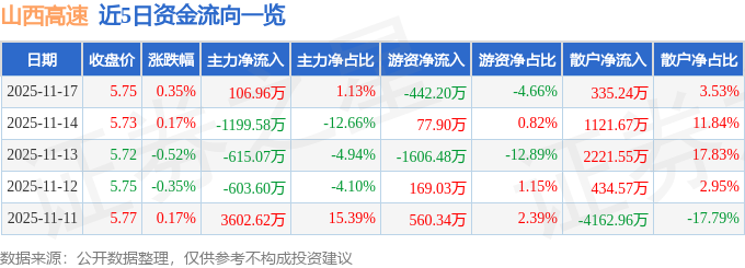 证券之星消息,截至2025年11月17日收盘,山西高速(000755)报收于5.75元,上涨0.35%,换手率1.13%,成交量16.54万手,成交额9497.85万元。