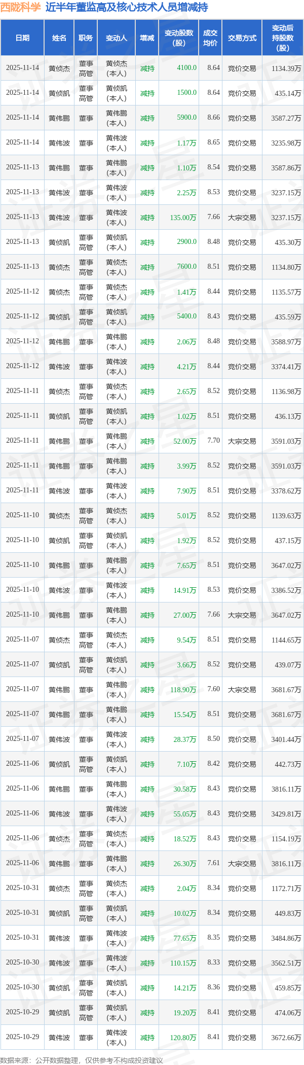 证券之星消息,根据11月17日市场公开信息、上市公司公告及交易所披露数据整理,西陇科学(002584)最新董监高及相关人员股份变动情况:2025年11月14日公司董事,高管黄侦凯、董事,高管黄侦杰、董事黄伟波、董事黄伟鹏共减持公司股份2.32万股,占公司总股本为0.004%。变动期间公司股价下跌0.92%,11月14日当日收盘报8.61元。