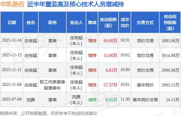 华凯易佰近半年内的董监高及核心技术人员增减持详情如下:
