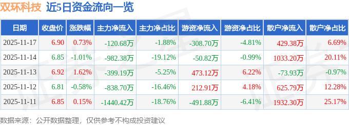 证券之星消息,截至2025年11月17日收盘,双环科技(000707)报收于6.9元,上涨0.73%,换手率2.01%,成交量9.34万手,成交额6414.59万元。