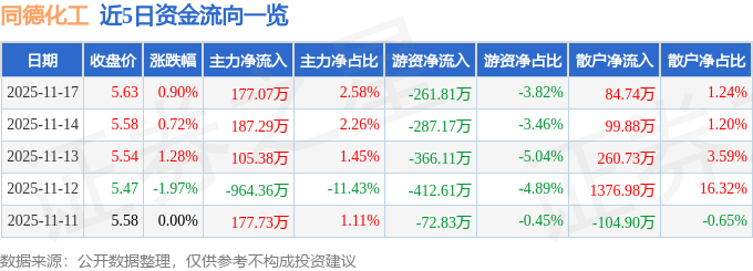 证券之星消息,截至2025年11月17日收盘,同德化工(002360)报收于5.63元,上涨0.9%,换手率3.74%,成交量12.24万手,成交额6858.31万元。