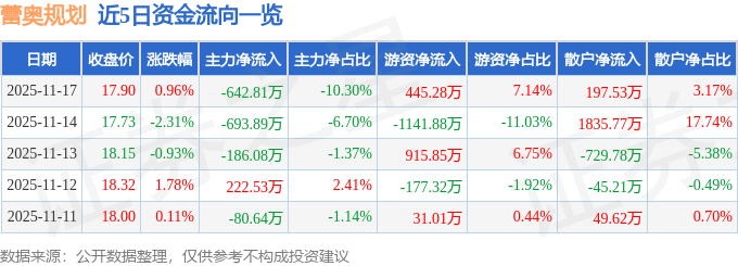 证券之星消息,截至2025年11月17日收盘,蕾奥规划(300989)报收于17.9元,上涨0.96%,换手率2.33%,成交量3.51万手,成交额6239.13万元。