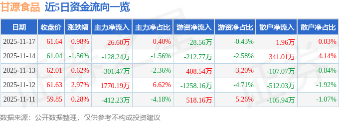 证券之星消息,截至2025年11月17日收盘,甘源食品(002991)报收于61.64元,上涨0.98%,换手率2.18%,成交量1.09万手,成交额6678.4万元。
