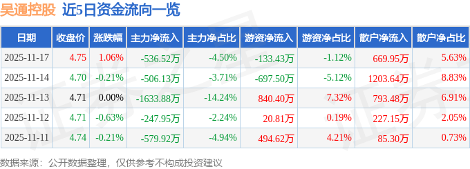 证券之星消息,截至2025年11月17日收盘,吴通控股(300292)报收于4.75元,上涨1.06%,换手率2.25%,成交量25.14万手,成交额1.19亿元。
