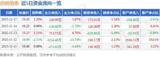 证券之星消息,截至2025年11月17日收盘,启明信息(002232)报收于19.45元,上涨1.2%,换手率1.43%,成交量5.83万手,成交额1.13亿元。
