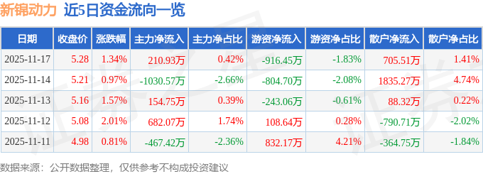 证券之星消息,截至2025年11月17日收盘,新锦动力(300157)报收于5.28元,上涨1.34%,换手率13.4%,成交量94.87万手,成交额5.0亿元。