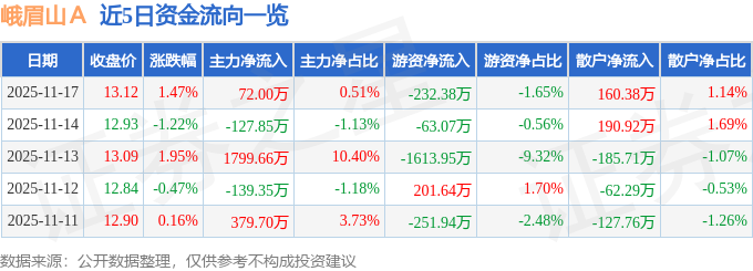 证券之星消息,截至2025年11月17日收盘,峨眉山A(000888)报收于13.12元,上涨1.47%,换手率2.05%,成交量10.81万手,成交额1.41亿元。