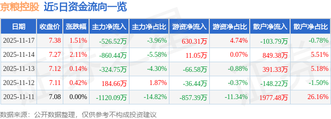 证券之星消息,截至2025年11月17日收盘,京粮控股(000505)报收于7.38元,上涨1.51%,换手率2.87%,成交量18.14万手,成交额1.33亿元。
