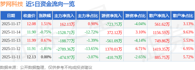 证券之星消息,截至2025年11月17日收盘,梦网科技(002123)报收于12.08元,上涨1.51%,换手率2.07%,成交量14.93万手,成交额1.79亿元。