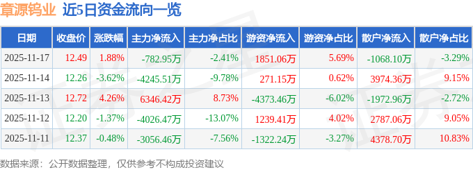 证券之星消息,截至2025年11月17日收盘,章源钨业(002378)报收于12.49元,上涨1.88%,换手率2.19%,成交量26.15万手,成交额3.25亿元。